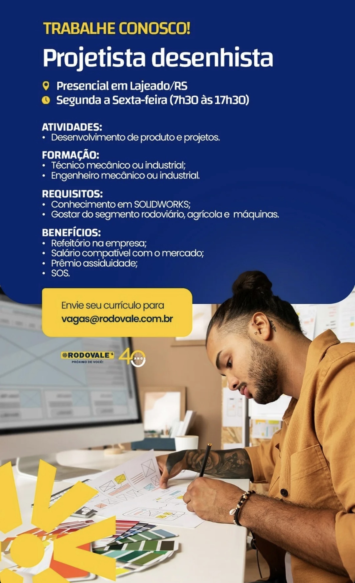 Conhecimento em SOLIDWORKS; Gostar do segmento rodoviário, agrícola e máquinas.
