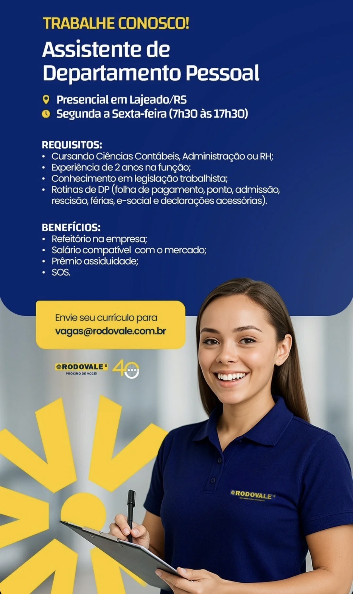 Cursando ciências contábeis, administração ou RH; Experiência de 2 anos na função; Conhecimento em legislação trabalhista; Rotinas de DP (folha de pagamento, ponto, admissão, rescisão, férias, e-social e declarações acessórias).,